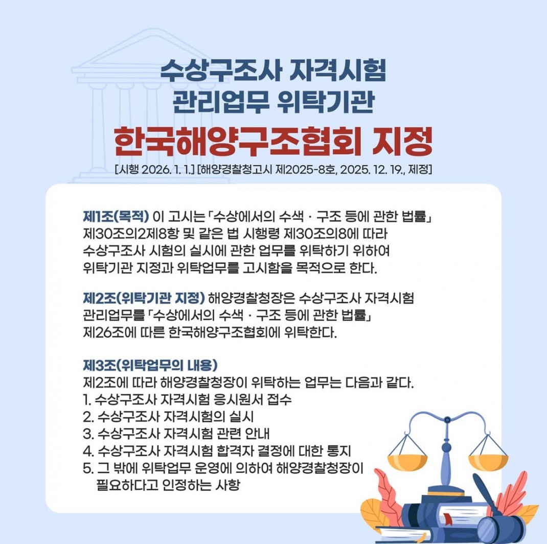 해양구조협회가 수상구조사 자격시험 관리업무 위탁기관으로 지정 되었습니다